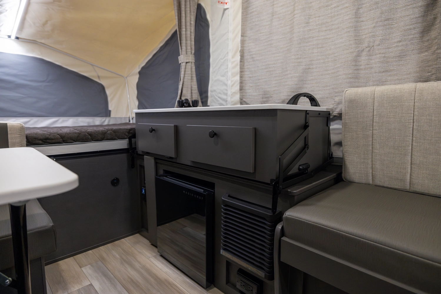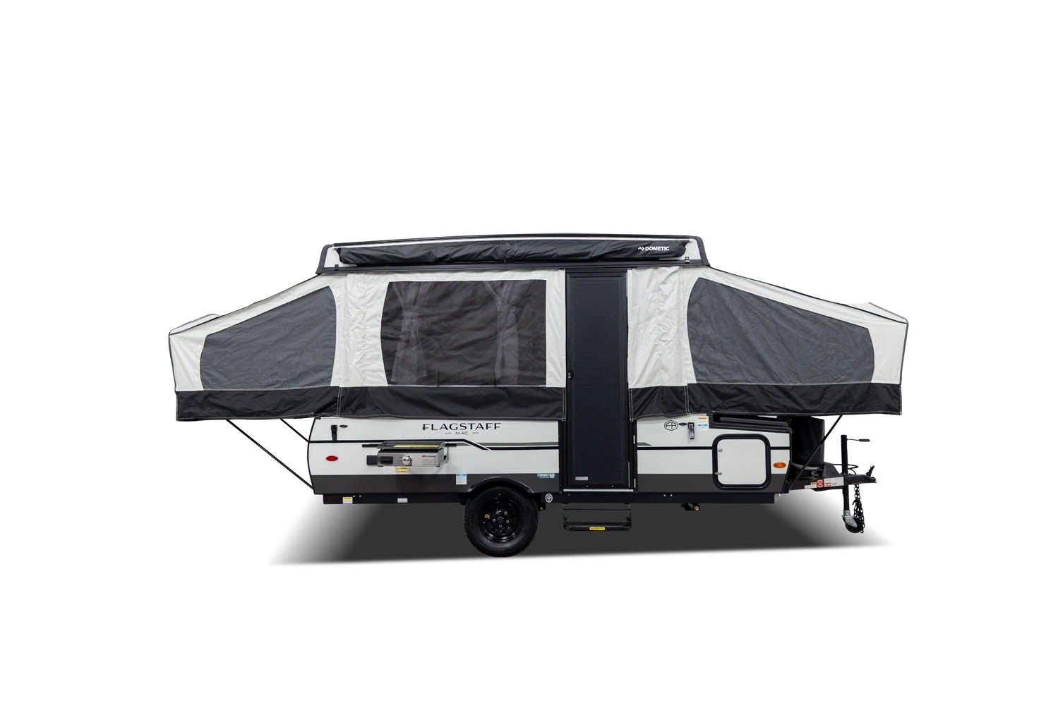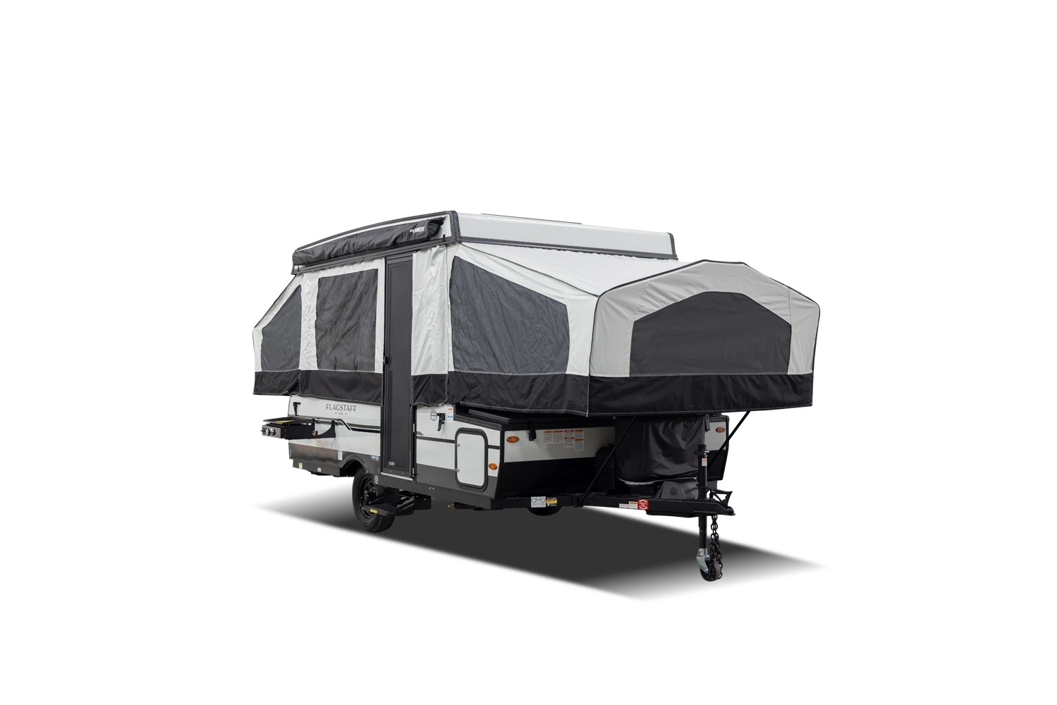MAXIMIZING YOUR INVESTMENT FOR THE LONG HAUL. Elevate your camping experience with the unmatched quality of the MAC series line, enhanced by a host of additional features. Imagine the comfort of a Create-a-Breeze fan for optimal ventilation, the convenience of a power roof lift, an outdoor grill for culinary adventures, four stabilizer jacks for stability, and the warm embrace of brilliant LED awning lights that gracefully guide you back to your camper as the sun sets. Embrace the luxurious side of camping with your Flagstaff tent camper, where 'roughing it' becomes a thing of the past.