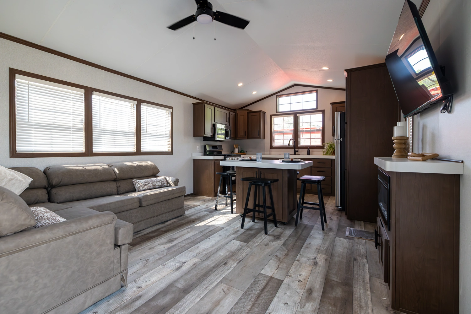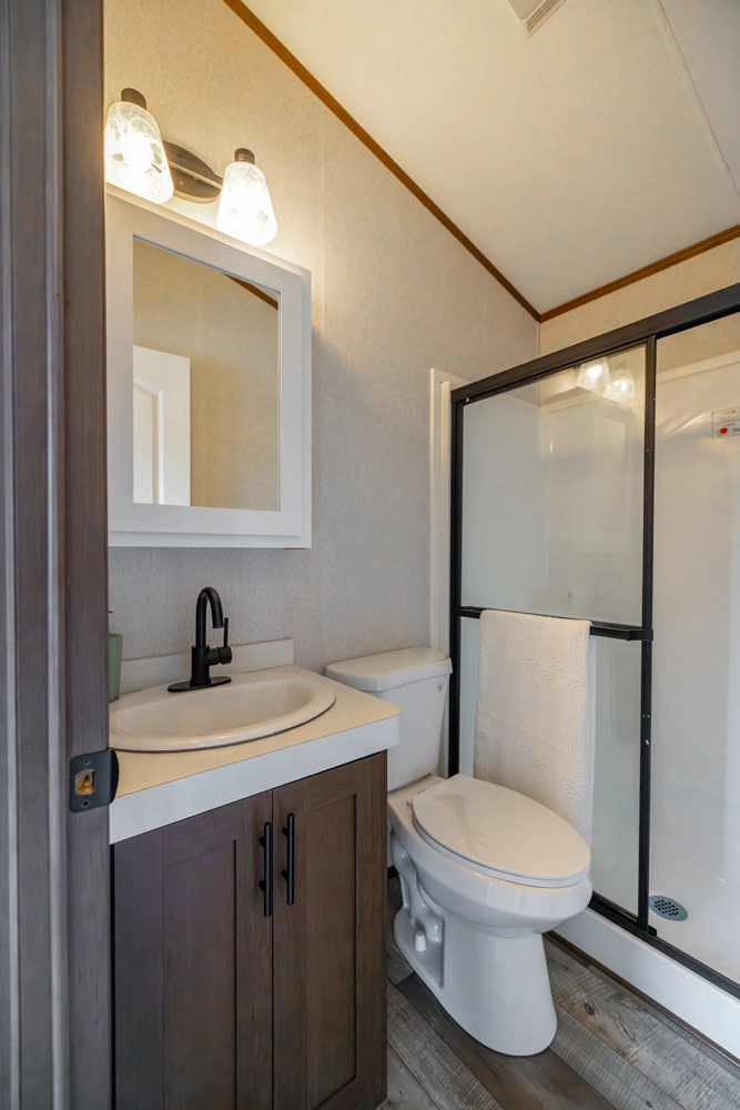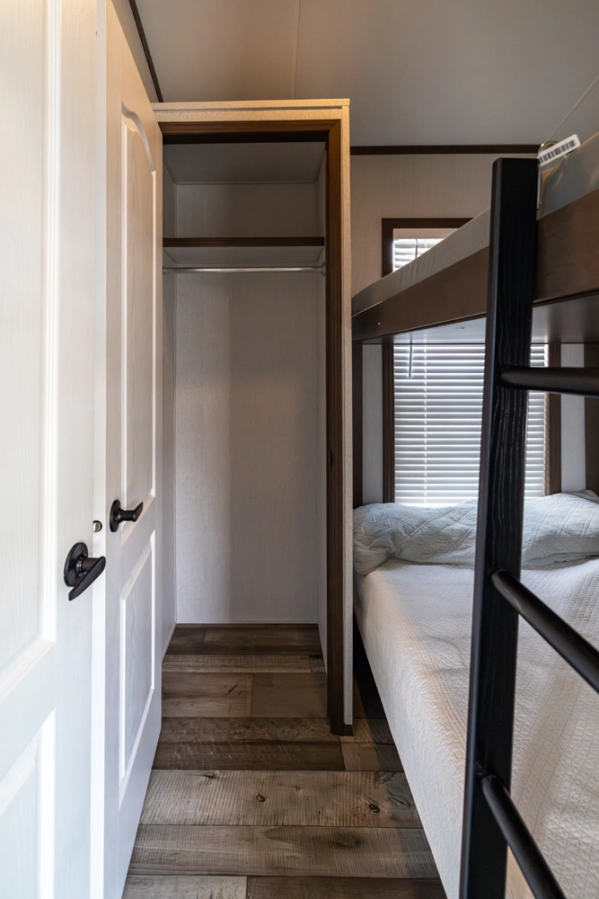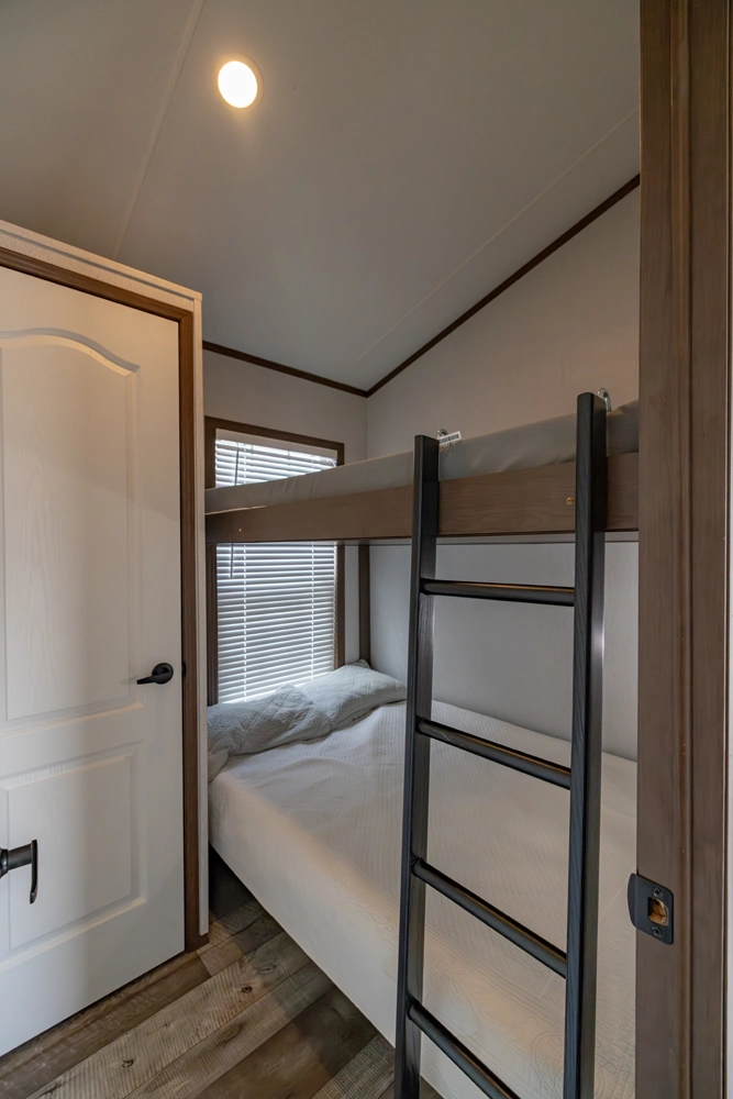 The 44FKBH-C spans 533 sq ft with a front kitchen, two bedrooms including bunks, and a dedicated living area. Its layout balances private and communal zones, while durable construction and solid insulation provide reliable comfort for seasonal stays at campgrounds.
