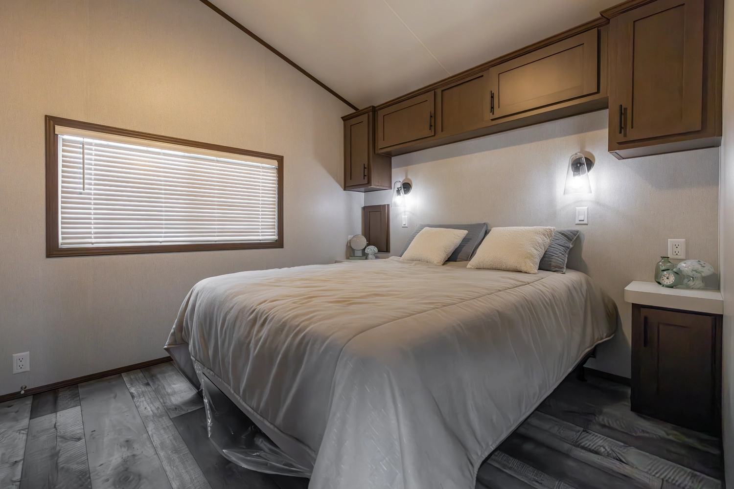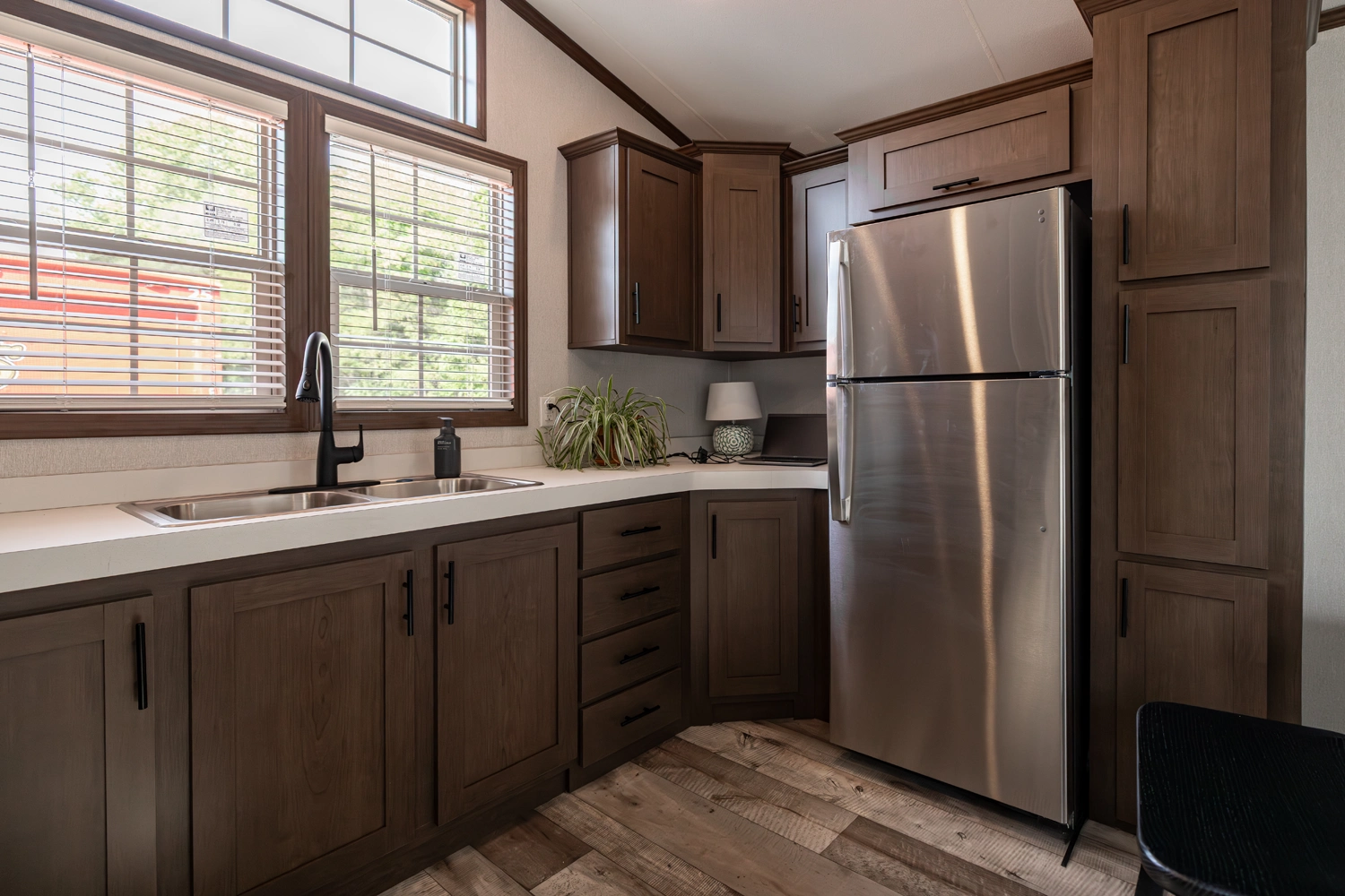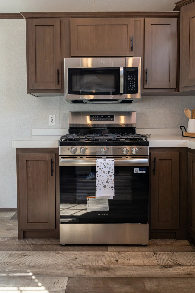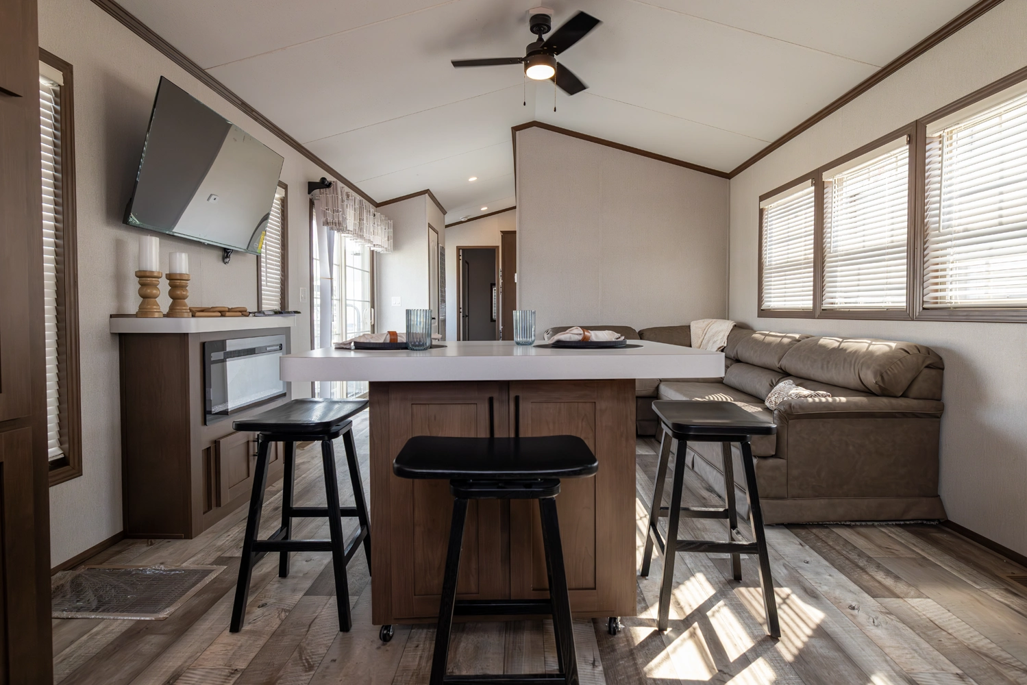 The 44FKBH-C spans 533 sq ft with a front kitchen, two bedrooms including bunks, and a dedicated living area. Its layout balances private and communal zones, while durable construction and solid insulation provide reliable comfort for seasonal stays at campgrounds.
