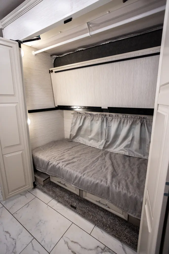 The Berkshire XL 40E is a three-slide bunkhouse model with two full bathrooms. The rear full bath includes a shower, vanity sink with medicine cabinet, and stacking washer/dryer. The bedroom has a slideout, 72" x 80" Tilt-a-View king bed, plus a dresser, wardrobe cabinet, TV, and overhead cupboard. The second full bath sits across from the bunk room/wardrobe combo. The kitchen is fully equipped, with a convection microwave, induction cooktop, and residential-style refrigerator.