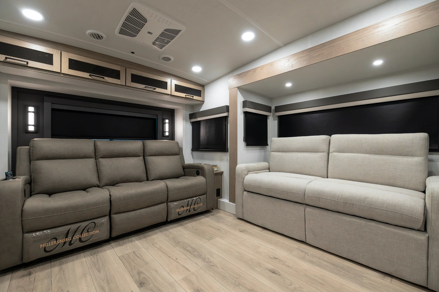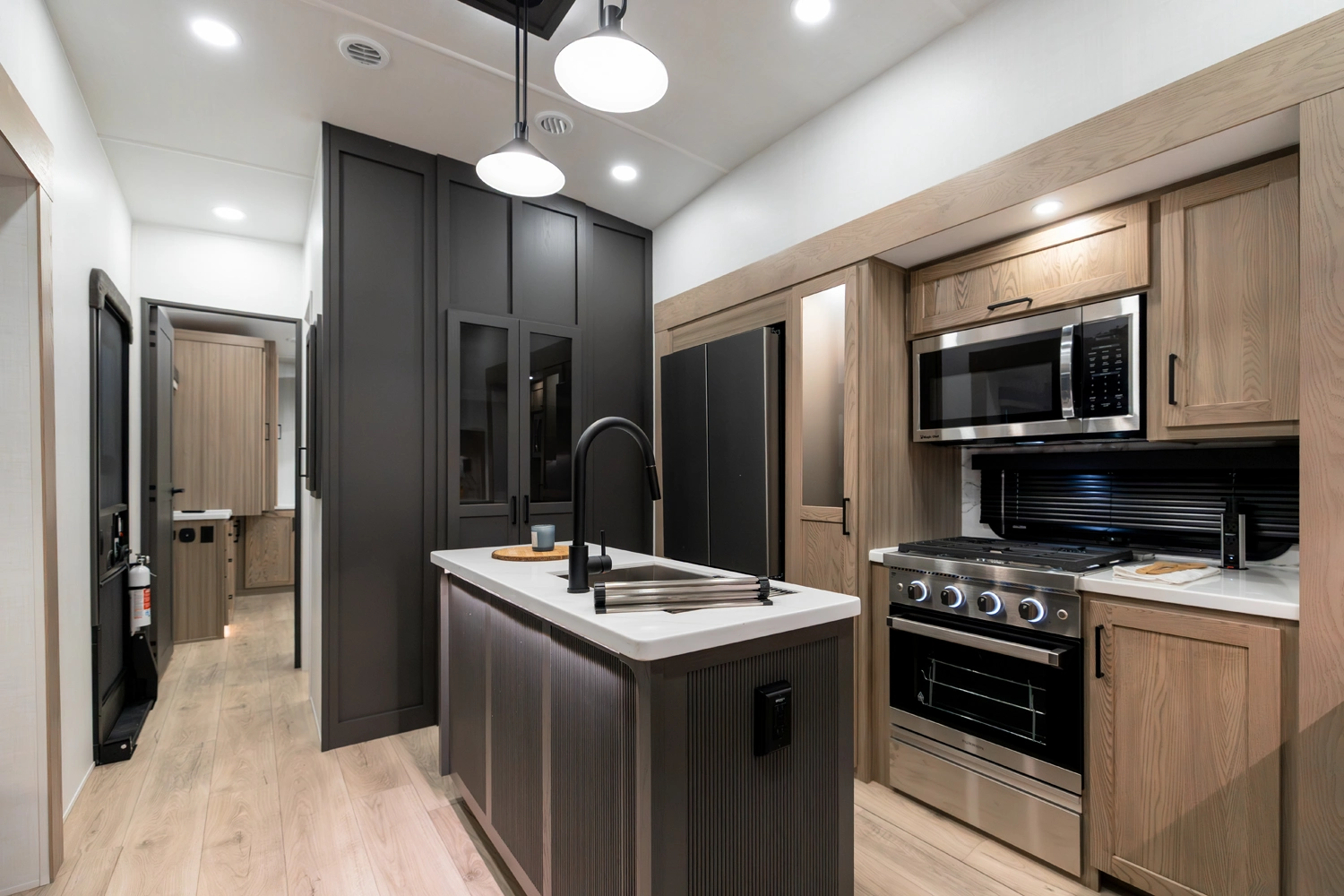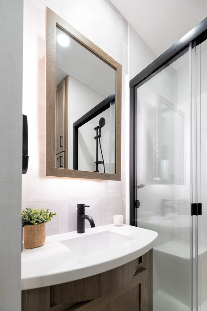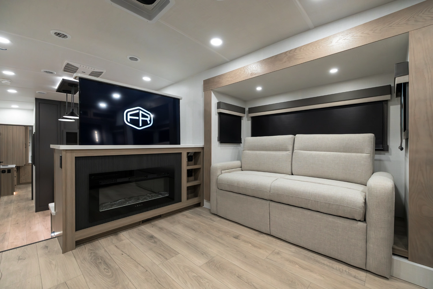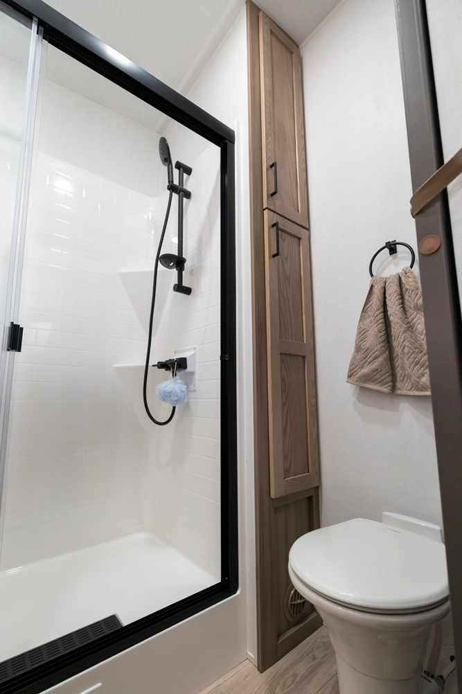 Our first 40' front living fifth wheel delivers luxury and space in every detail! The front lounge features dual 68" hide-a-beds, a 78" theater seat, fireplace, and televator TV. The central kitchen includes an island, double pantries, and rotating dinette seating. The private rear bedroom offers a king bed, washer/dryer prep, and ample storage. With dual awnings and pass-thru storage, it’s made for elevated travel living.