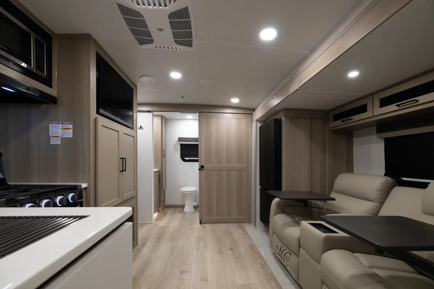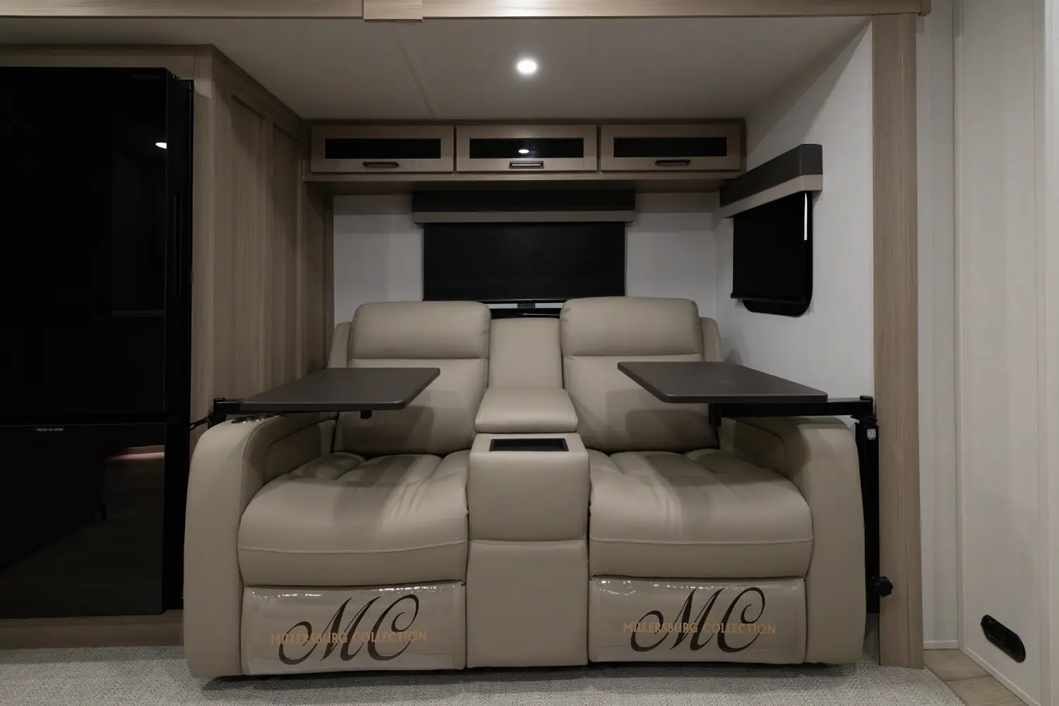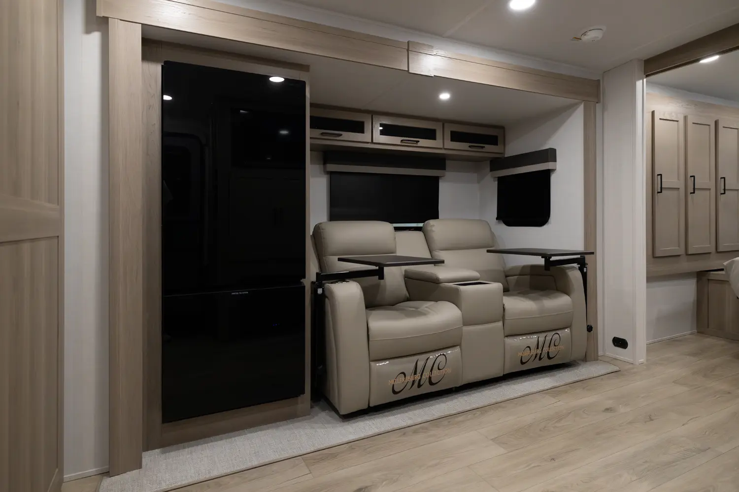 This unit is unique with its big 36" sliding doors leading to the bathroom and bedroom. These doors make moving around for a broad shouldered person easier and comfortable. The entertainment center is loaded with 32" tv, a residential-style soundbar and a fireplace space heater. Across from this lovely entertainment center is a 72" theatre seating which is perfect for reclining and watching a good movie.