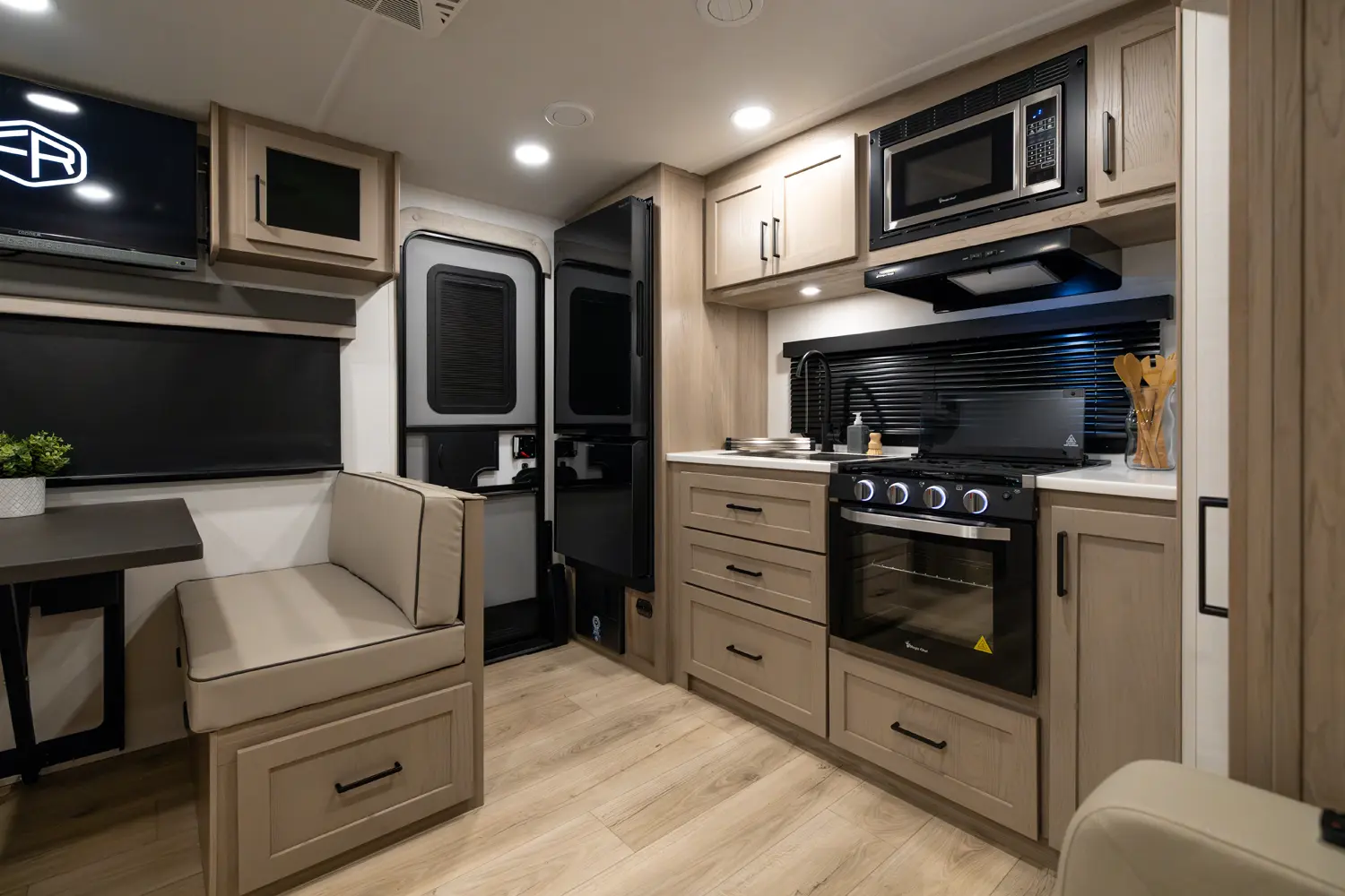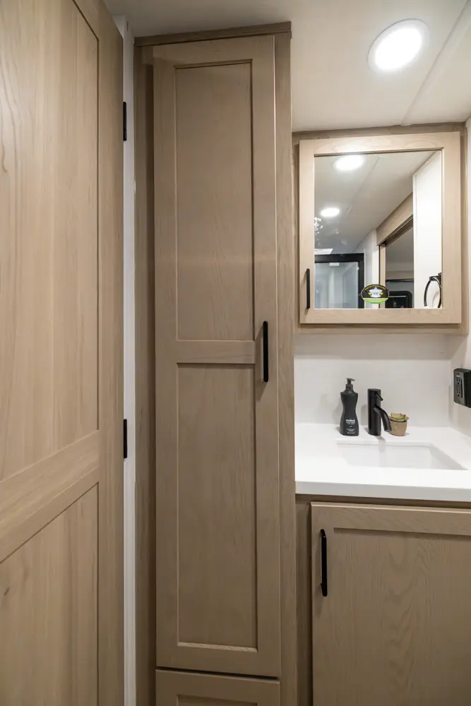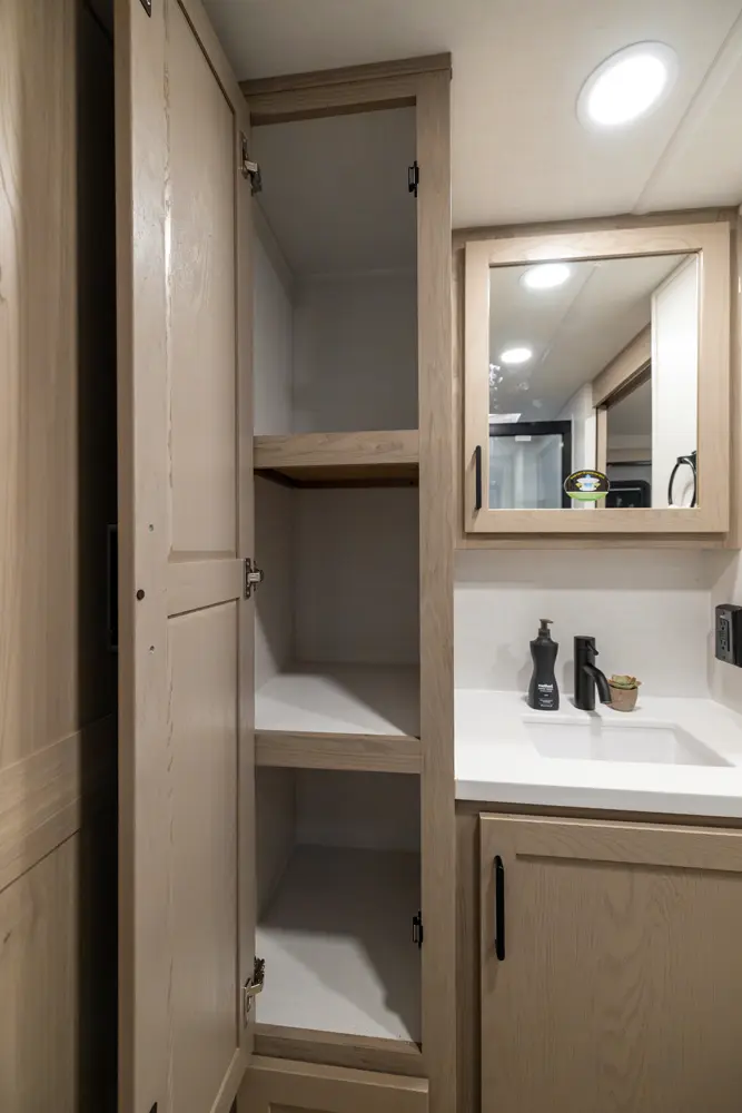 The 25SRK offers a spacious convenient layout with two entry doors providing easy access to the kitchen, bedroom, and bathroom, all while the slides are retracted. The rear kitchen features ample counter space while the living area includes a U-shaped dinette and theater seating. (optional hide-a-bed) The wardrobe slide adds generous storage making this a perfect choice for families or couples seeking flexibility and functionality on the road.