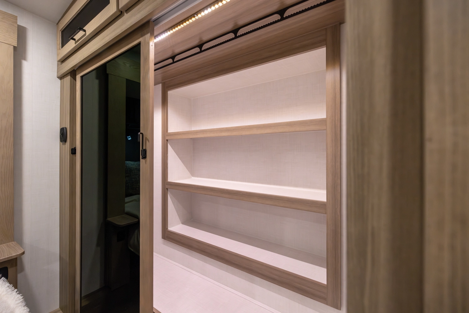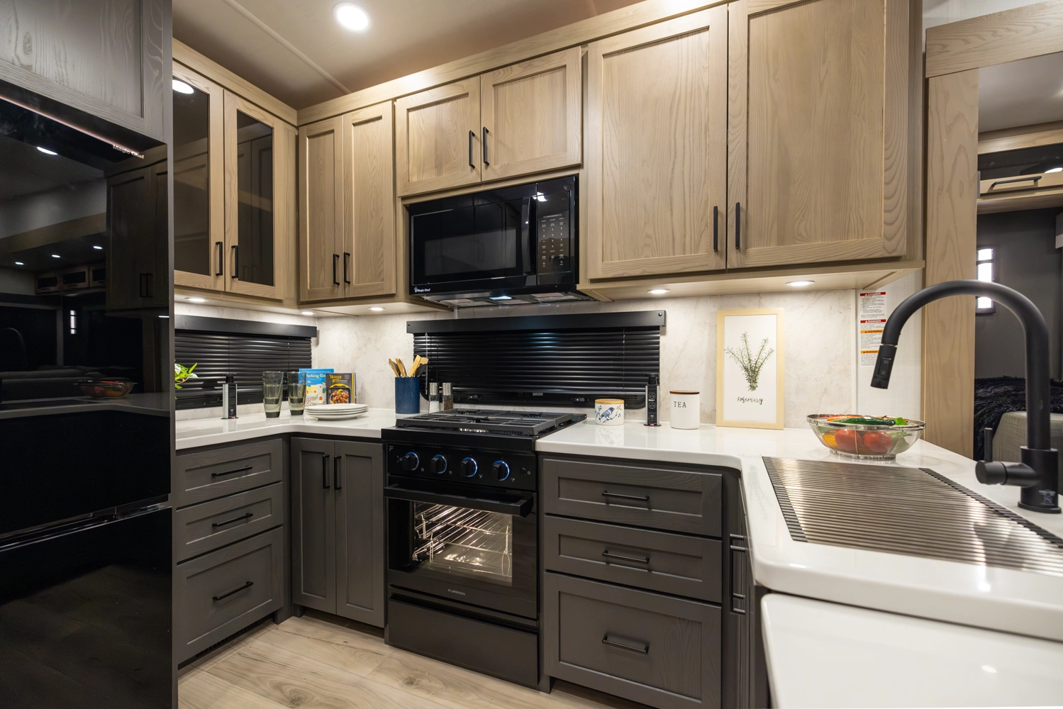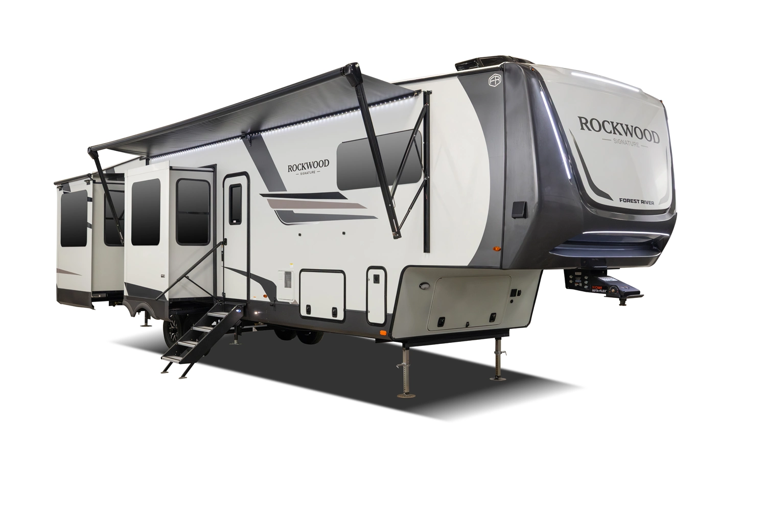 This 101" Wide Body fifth wheel is a rear kitchen layout features expansive counter space, residential style appliances, and abundant storage, making it ideal for those who love to cook while traveling. The mid living area features an L-shaped sofa with an integrated Hide-a-bed and 52" theater seat that requires no dismantling when the slides are retracted. Up front you have a private bedroom with a king bed and generous wardrobe space that is Washer/Dryer ready!