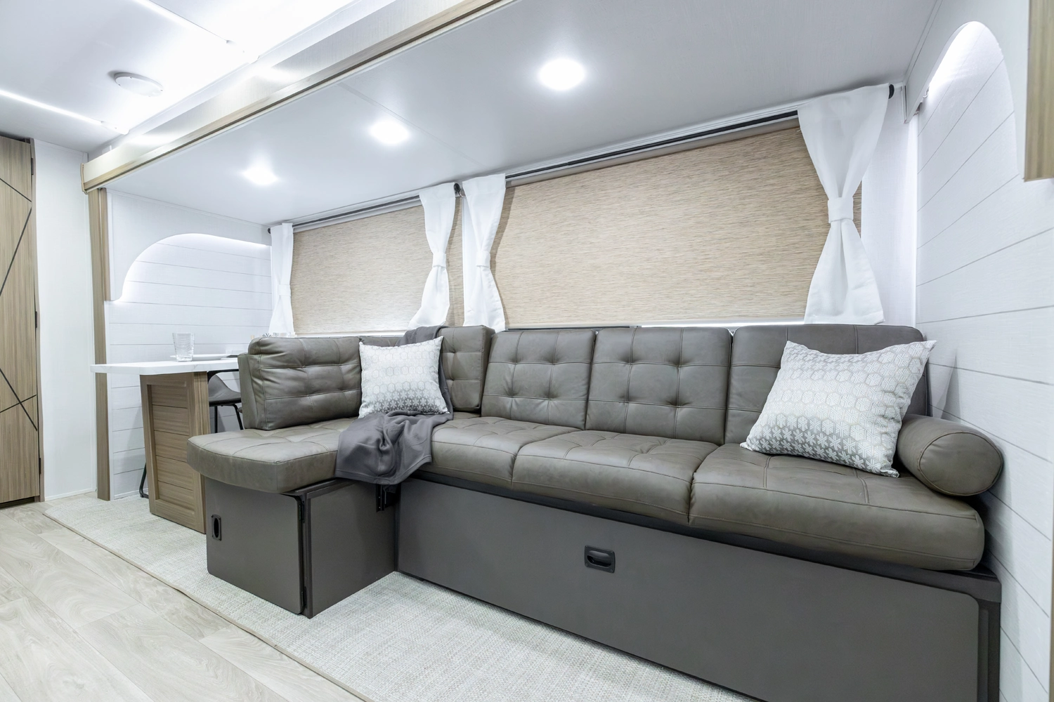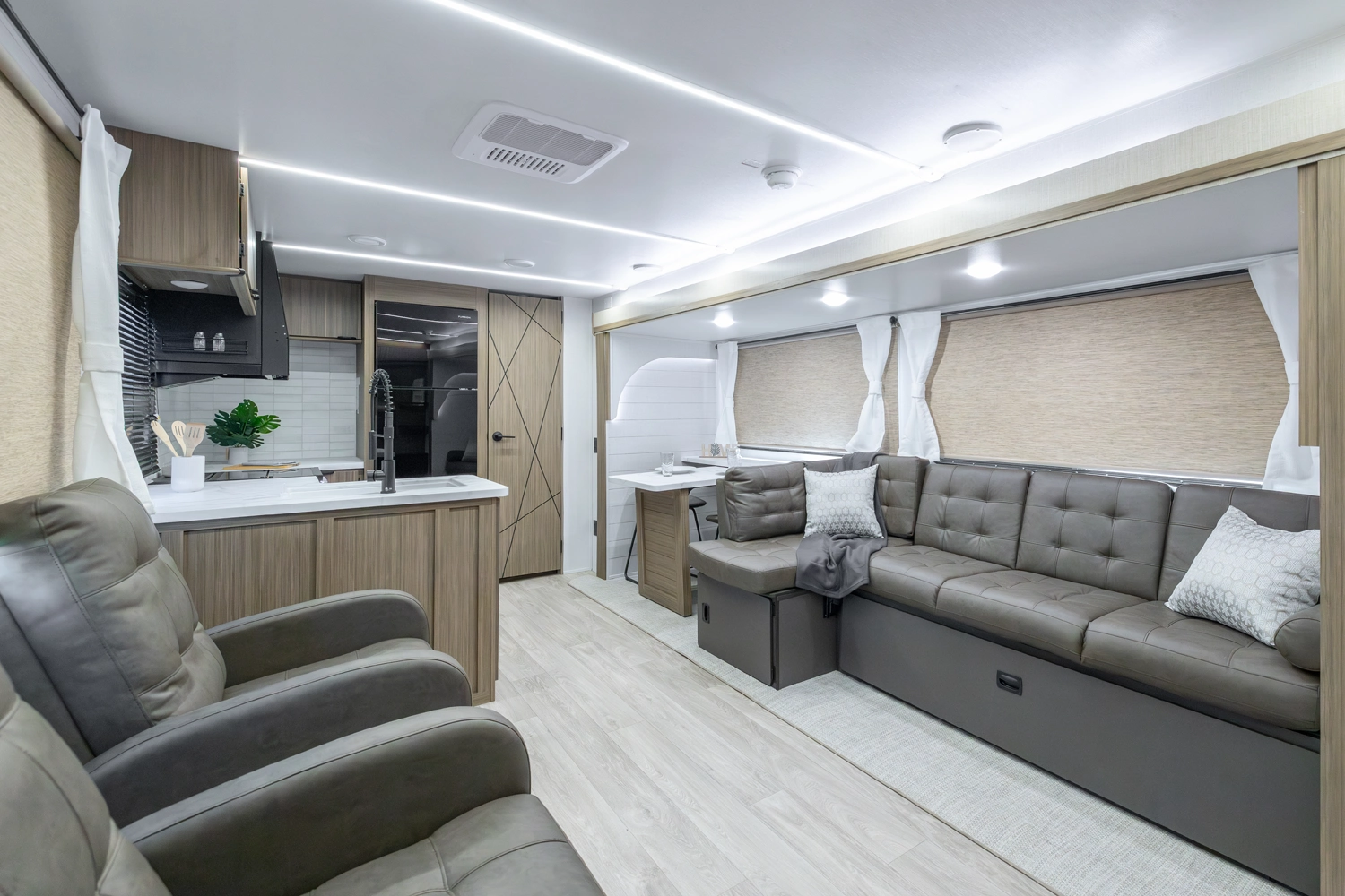 The 27RK stands out with its spacious kitchen and panoramic campsite windows. You will love the Versa-Lounge, which can reconfigure and customize according to your needs—and conveniently below is the Stow N Go Storage! This model also provides a fireplace (heater) and 11 CU. FT. refrigerator making you feel right at home.