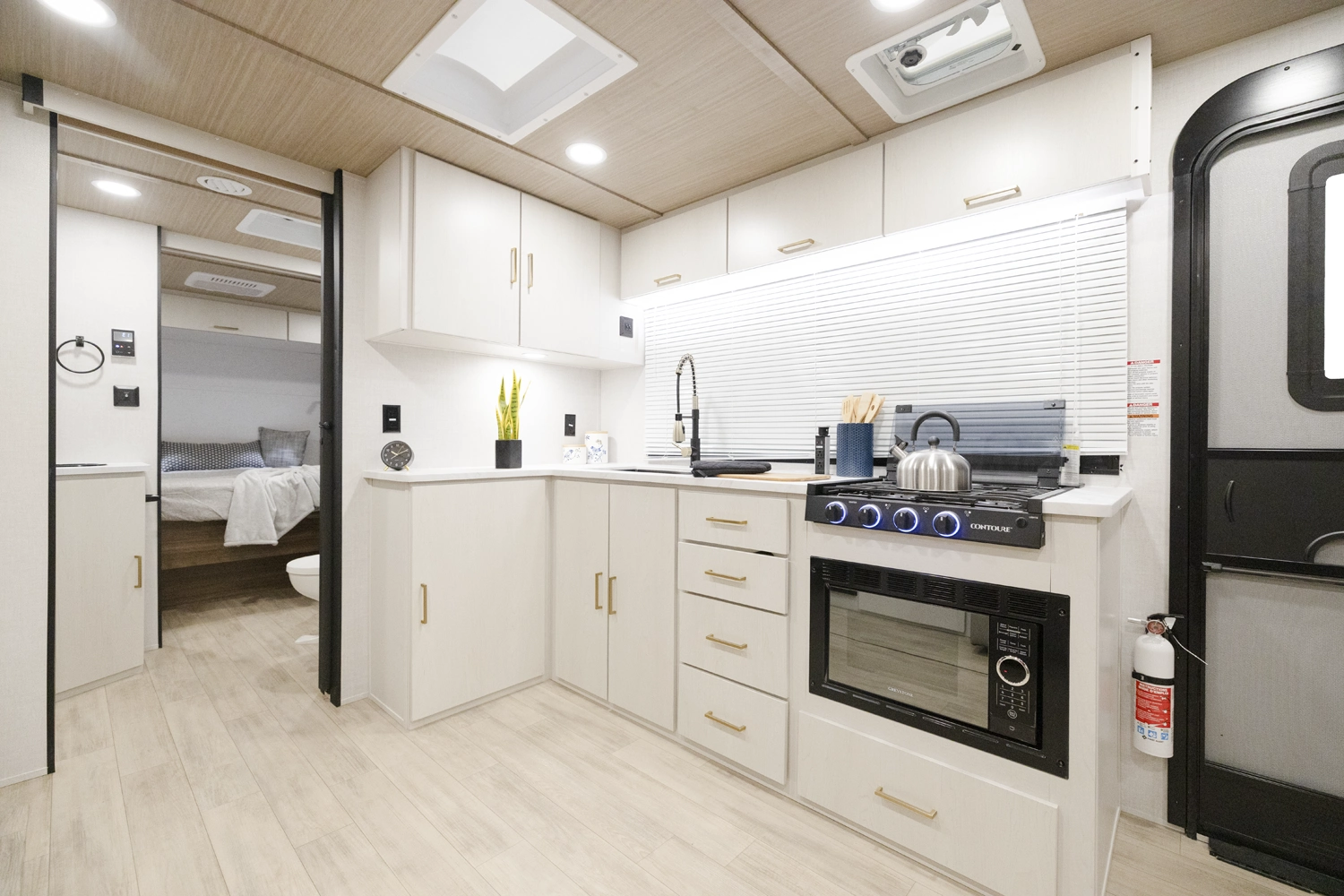 The 2400RB is great for couples who enjoy scenic views from the comfort of their living space. With almost a full panoramic view in part to our European-Style square windows, there is no shortage of natural light with a spacious open feel. The 2400RB comes packed with already added features such as 2 A/Cs, a king bed, porcelain toilet and much more!