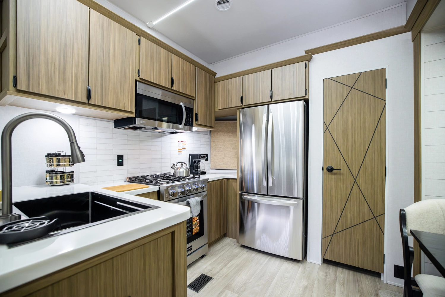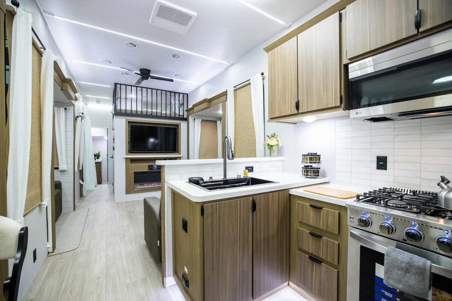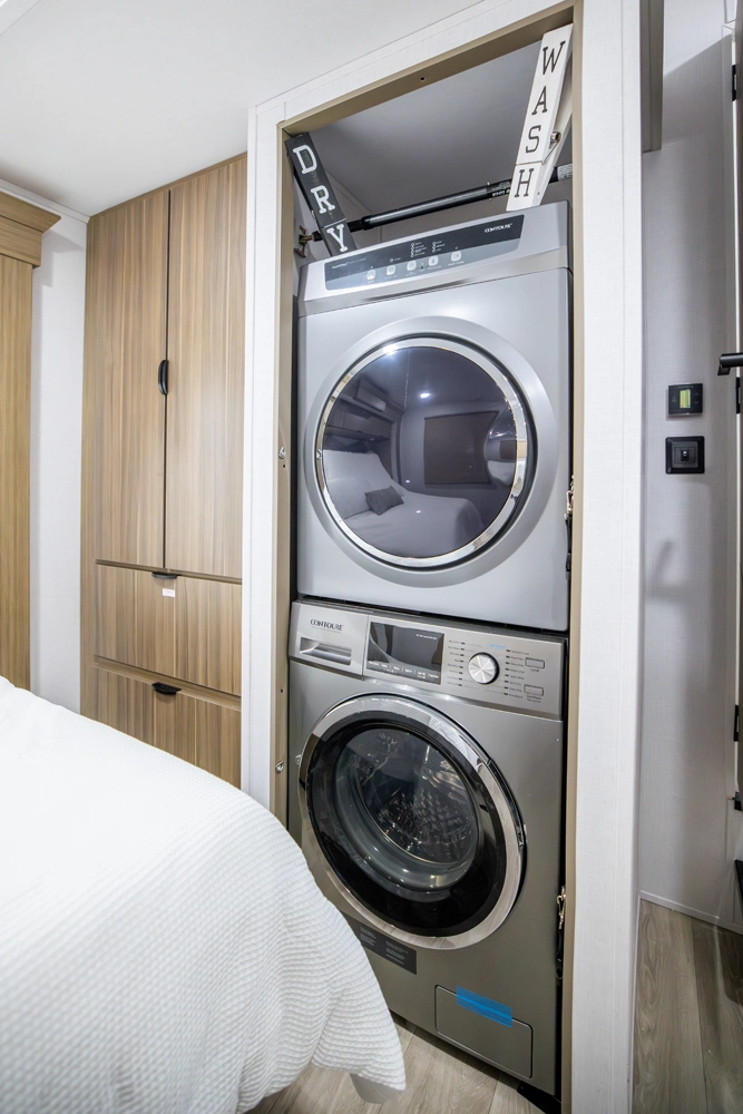The Wildwood Grand Lodge 42FK is a truly exceptional destination trailer. The large front kitchen is equipped with residential appliances, tons of cabinet and pantry space, and a free-standing dinette. The large living area provides two sofas and an entertainment center with TV and fireplace, while the large rear master bedroom offers a full wardrobe and dresser. The HUGE walk-up loft is perfect for friends and family, with four separate bunks and plenty of space to stretch out.